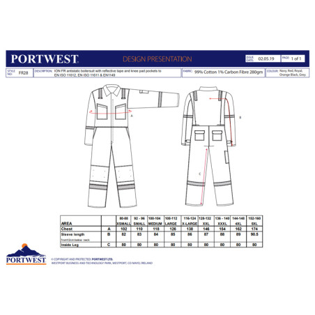 Portwest FR28 - Tuta intera ignifuga antistatica leggera 280g OEKO-TEX fino alla 5XL