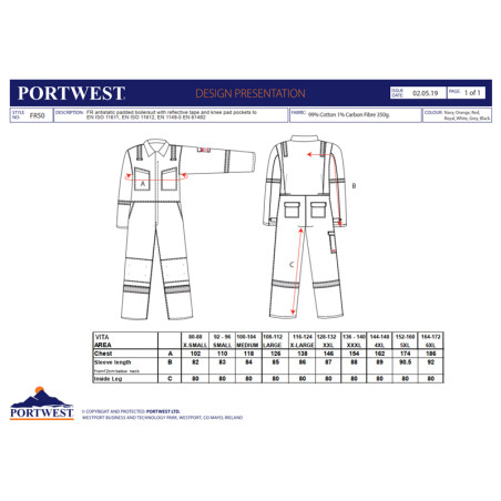 Portwest FR50 - Tuta da lavoro 6XL antifiamma e antistatica OEKO-TEX 350gm taglie forti