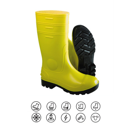 Realizzata con mescola "PPLUS", speciale miscela composta da cloruro di polivinile (PVC) ed agenti plastificanti stampata a caldo mediante processo di estrusione e iniezione. Notevole resistenza a grassi animali, olii vegetali, idrocarburi e sostanze chimiche. Altissima resistenza all'abrasione. Suola speciale con battistrada molto pronunciato per una maggiore aderenza su superfici friabili ed oleose. Tallone cavo per favorire l'assorbimento degli urti.