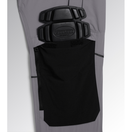 Porta ginocchiere in tessuto antiabrasione a contrasto con apertura dall'alto e zip con soffietto in rete laterale per una maggior traspirabilità.