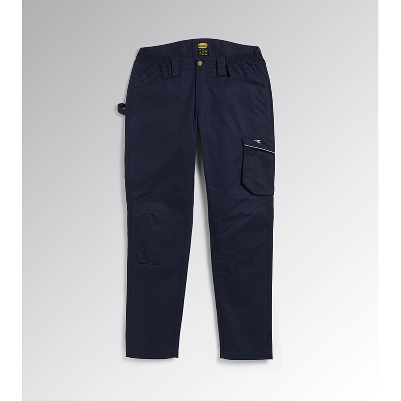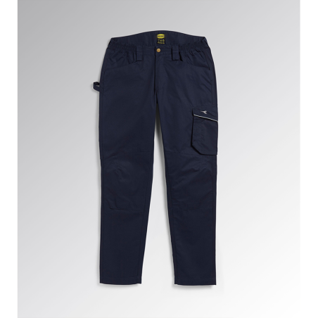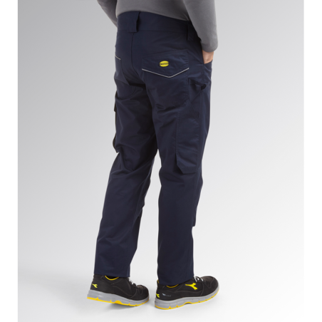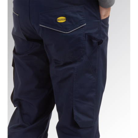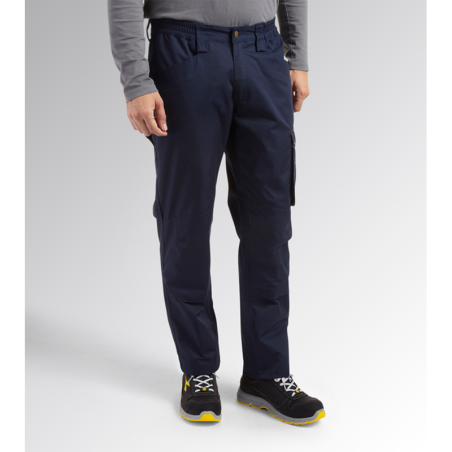 Pantalone in cotone twill con ginocchiere, tasca laterale, dettagli rifrangenti, tasca portametro, portamartello, elastico in vita, tripla cucitura.