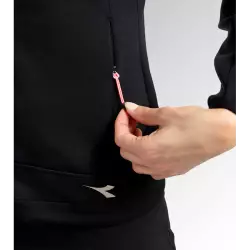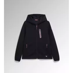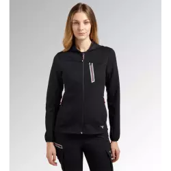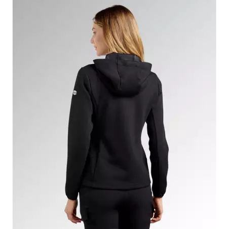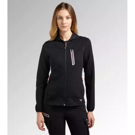 Felpa scuba con cappuccio pensata per il mondo del lavoro femminile. Zip con protezione sulla zona del mento. Due tasche laterali con puller a contrasto e una frontale chiusa con zip a contrasto e dettaglio reflex. Maniche ergonomiche e polsini in Lycra.