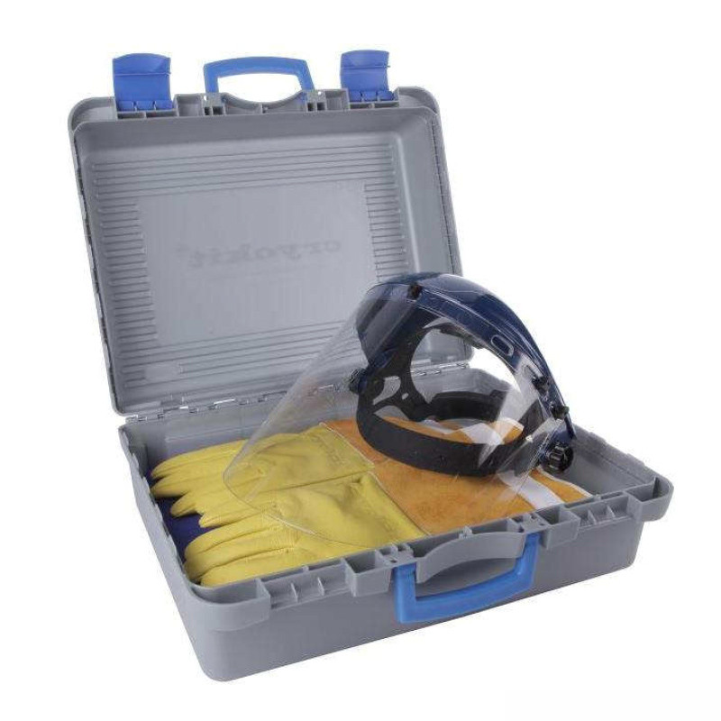 Kit completo di tutti i DPI per una protezione integrale, composto da un paio di guanti CRYOPLUS-2.0, una visiera CLEAR-CRYO, un grembiule T-CRYO LIGHT, un paio di sovrascarpe GHETTE-CRYO contenuti in una valigetta.