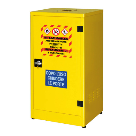 Armadio di sicurezza componibile per lo stoccaggio liquidi infiammabili realizzato in lamiera di acciaio al carbonio P02 spessore 8/10, pre-trattato con fosfosgrassaggio in tunnel alte temperature, verniciatura in epossipoliestere colore GIALLO RAL1021 e cottura in galleria termica 180°.
