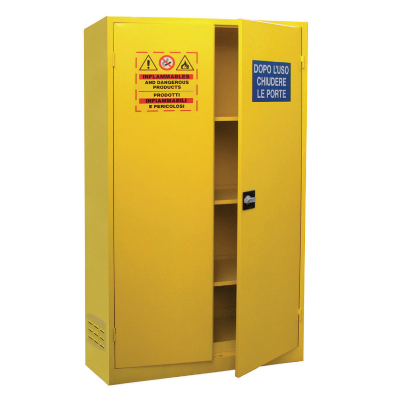 Armadio di sicurezza monoblocco per lo stoccaggio liquidi infiammabili realizzato in lamiera di acciaio al carbonio P02 spessore 10/10, pre-trattato con fosfosgrassaggio in tunnel alte temperature, verniciatura in epossipoliestere colore GIALLO RAL1021 e cottura in galleria termica 180°.